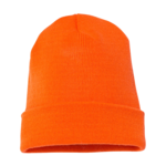 Yupoong Knit Cap With Cuff. 100% hypoallergenic acrylic. Approximately 12 long to allow for cuff. Hand washable. Heavyweight knit cap.