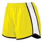 Augusta Girls Junior Fit Pulse Team Short. Shell is 100% polyester micropoly *Inserts are 100% polyester mesh *Lining is 100% polyester wicking crepe *Liner wicks moisture away from the body *Junior fit *Low rise *Covered elastic waistband with inside drawcord *Inner brief with leg elastic *Inside key pocket *Mesh inserts on panel *4-inch inseam *Contrasting self-fabric binding on side panels and hem. Also available in Ladies, Style 1265.