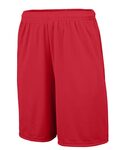 Augusta Sportswear Youth 9 Poly Wicking Knit Training Shorts. 100% polyester wicking knit, full cut. Pad print label. Covered elastic waistband with inside drawcord. Double-needle hemmed bottom. Youth inseam graded.