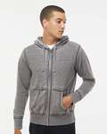 J-America Adult Triblend Fleece Hooded Pullover. 7.5 ounce Tri-blend fleece 55% cotton, 39% polyester, 6% rayon. Off-white drawcords. Front pouch pocket. Coverstitched throughout.